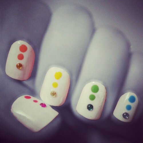 3 punts 30 junio, 2013 · de Nia's nails · en Puntejat. · Punts de colors sobre una base en snow white d’OPI, rematats amb brillants a joc. Comparte esto: Compartir en X (Se abre en una ventana nueva) X Compartir en Facebook (Se abre en una ventana nueva) Facebook Me gusta Cargando... Relacionado