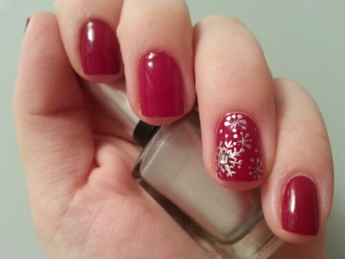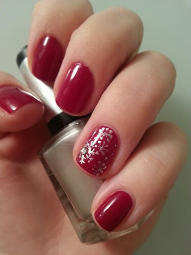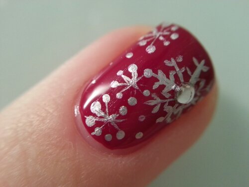 Aquesta setmana, flocs de neu platejats sobre un fons en vermell fosc, rematats amb un brillantet al centre del floc principal.