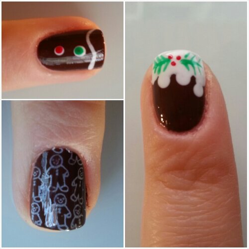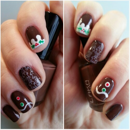 Els dits mig i anular estan inspirats en les galetes nadalenques popularment conegudes com gingerbread. El dit mig està ple de galetes estampades en color blanc. I al dit anular hi ha pintat el detall d’una galeta.