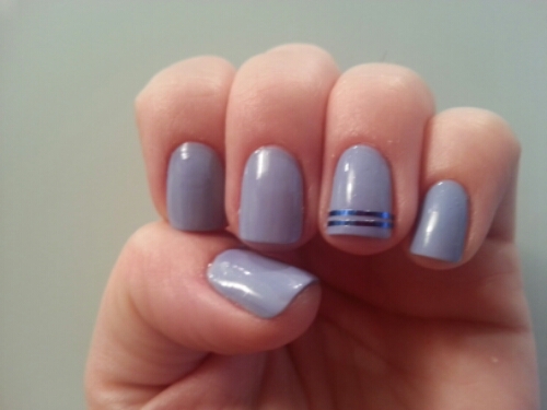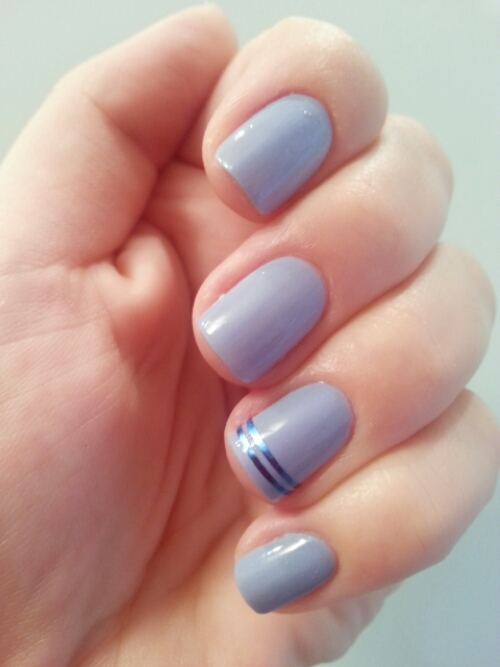 Aquí en podeu veure una en blau-lila d’Essie, rematada amb dues línies en blau marí elèctric que donen un toc diferent però mantenen l’essència de la bàsica.