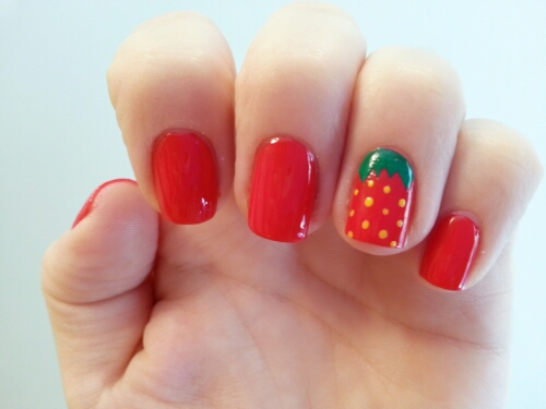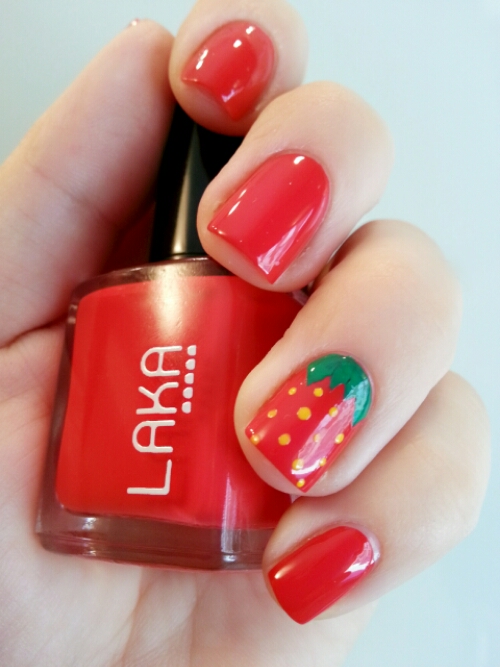 Manicura bàsica amb esmalt n. 69 de Laka, acompanyada d’una maduixa pintada al dit anuŀlar. El disseny està pintat a mà amb utilitzant groc i verd de Kiko.