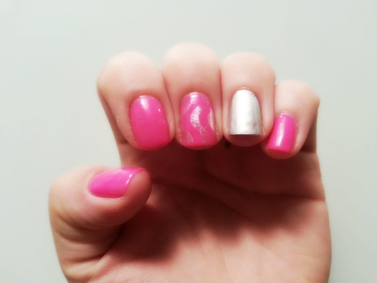 Nails in fluor pink and silver. On the middle finger, some waves stamped with grey. Do you like it?