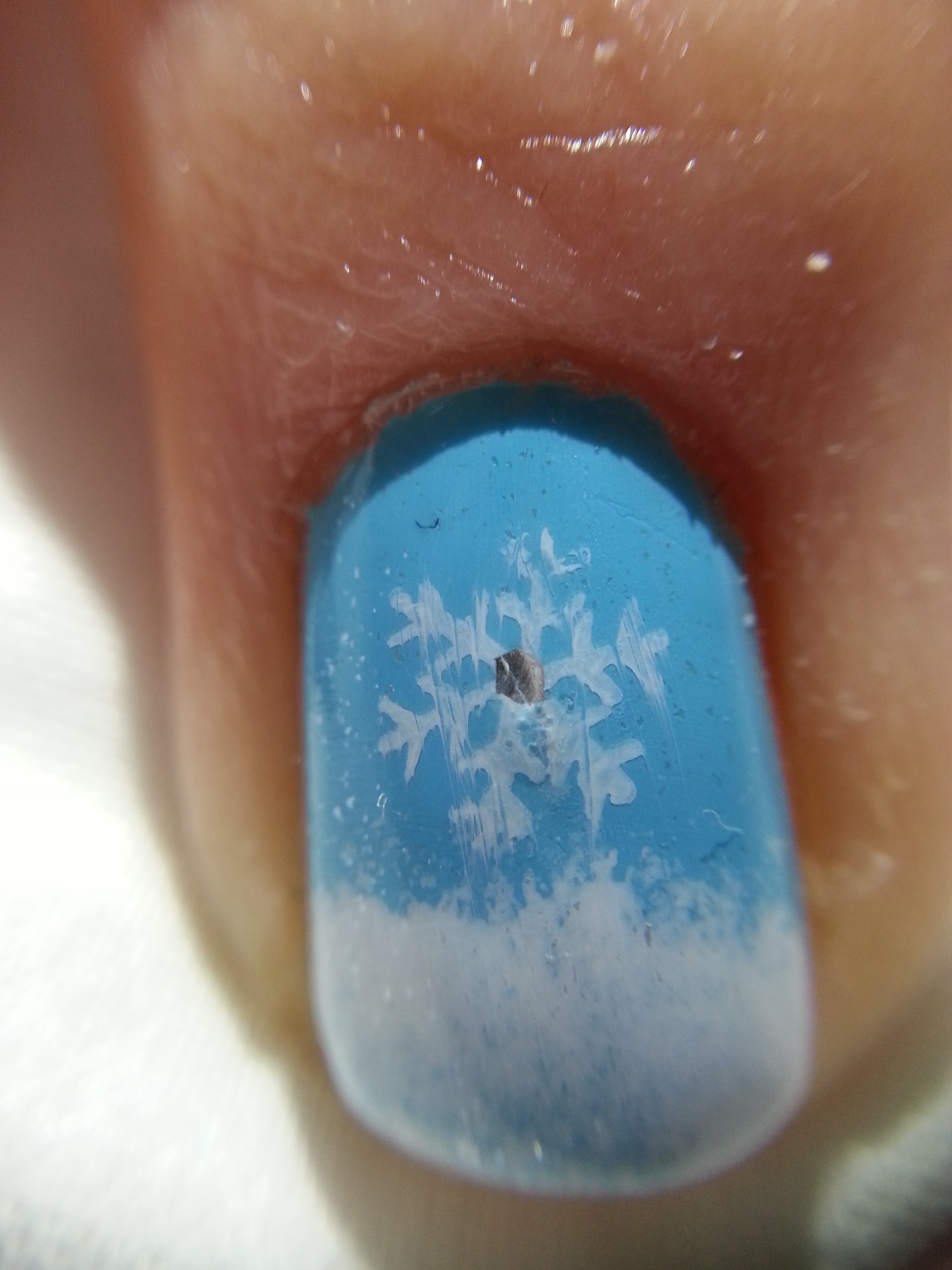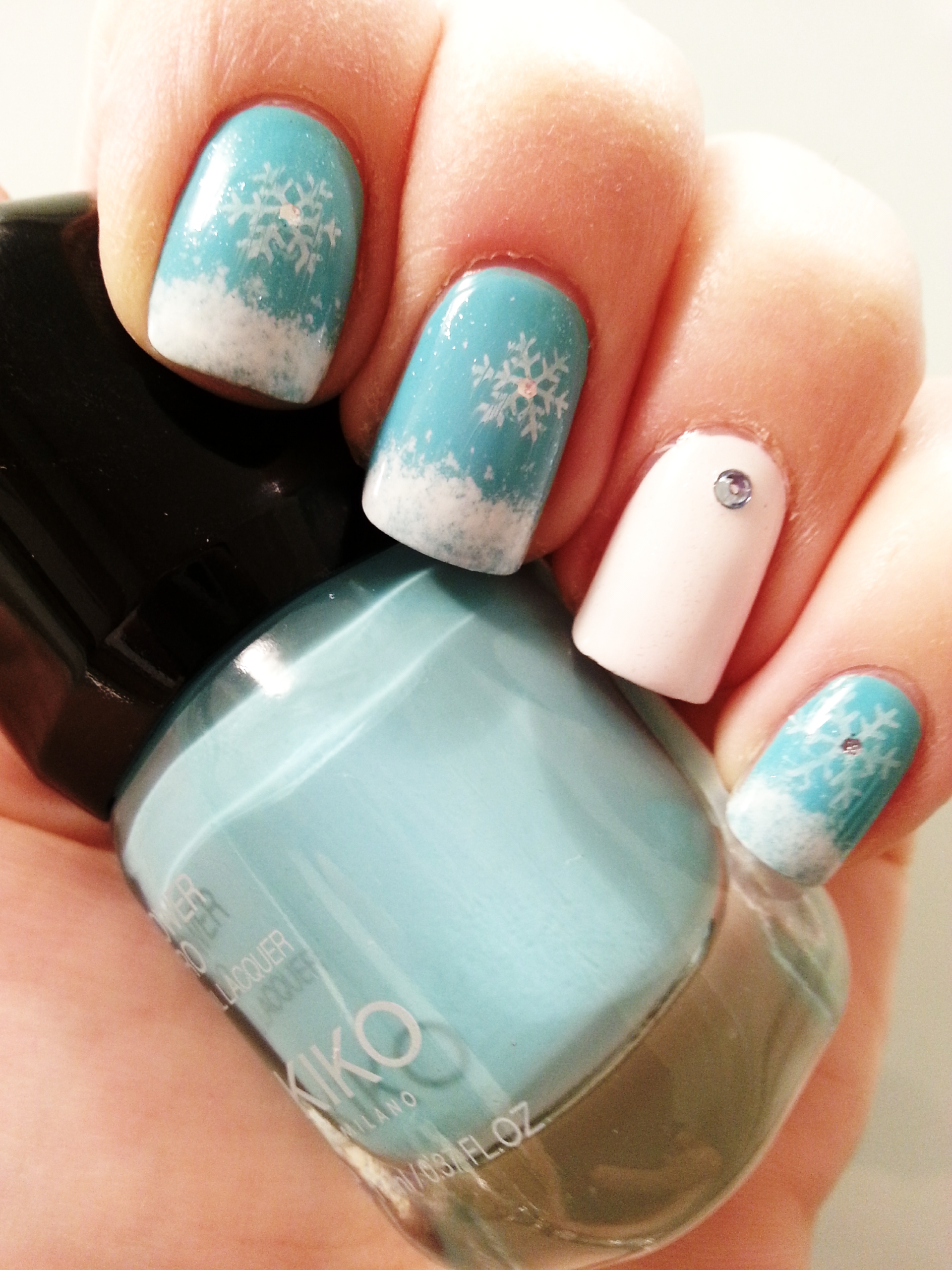 Sobre una base azul de Kiko, he estampado copos y aplicado esmalte blanco con esponjita para crear efecto de nieve.
