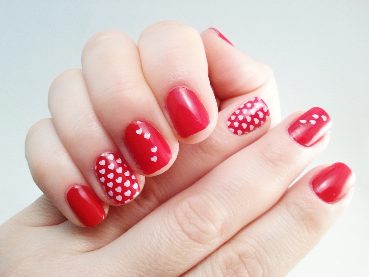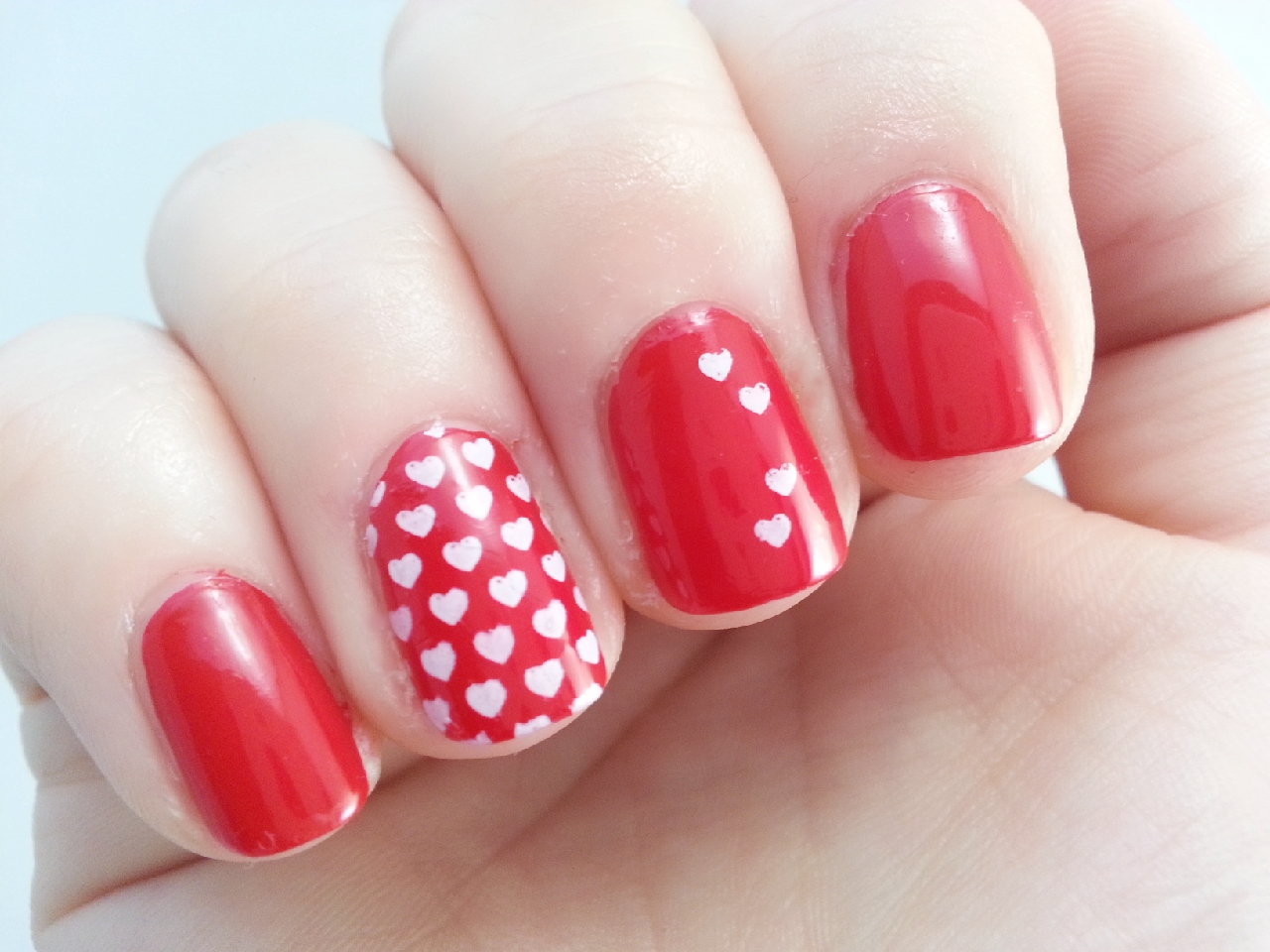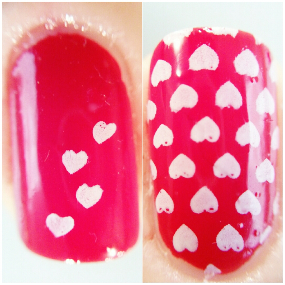 Como veis, para la base elegí un rojo intenso de Kiko, y estampé unos corazones blancos en los dedos corazón y anular.