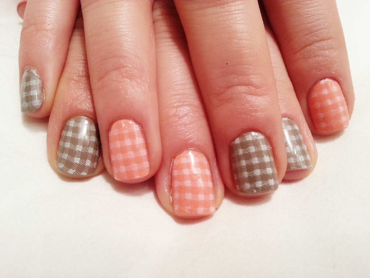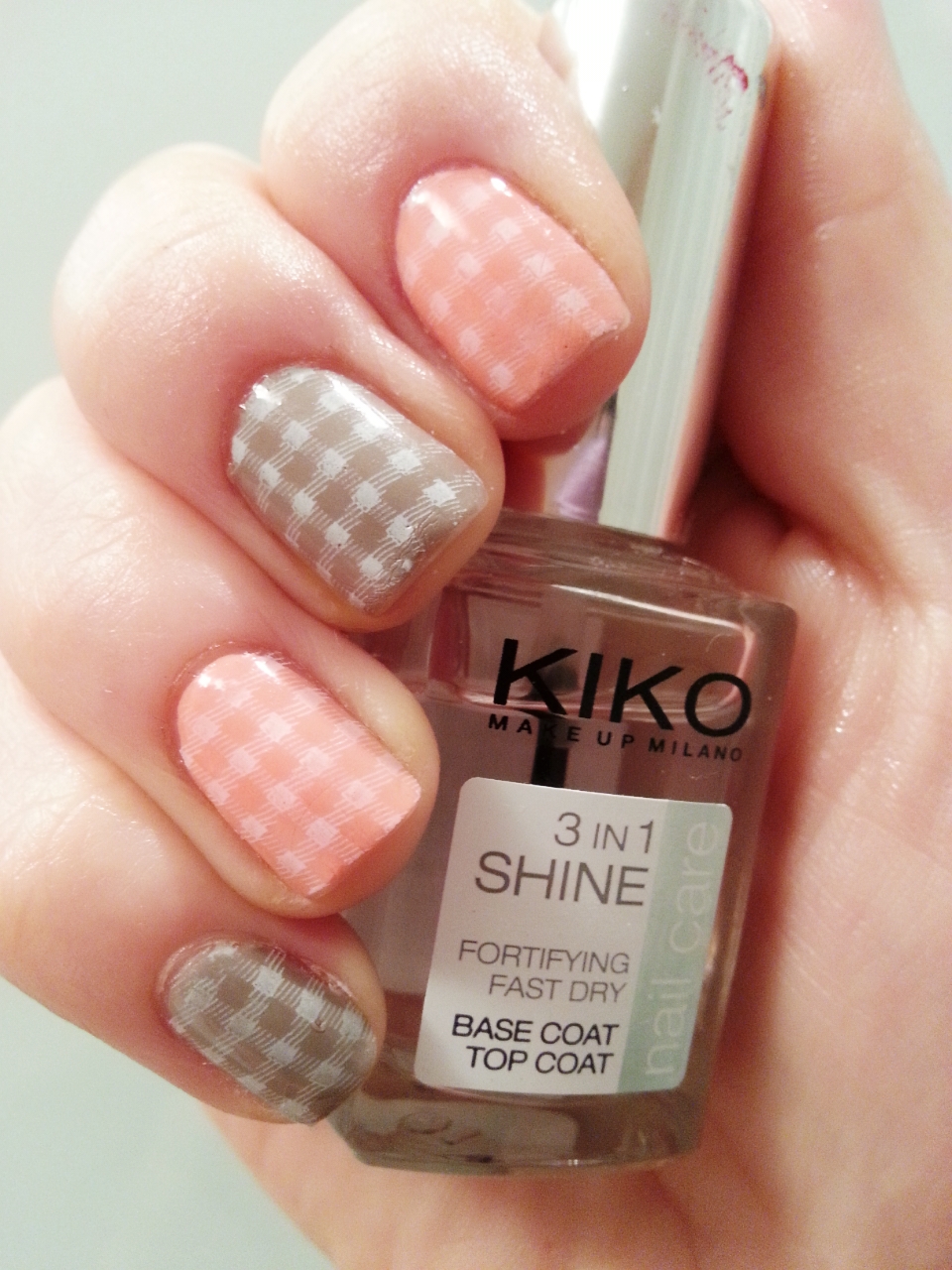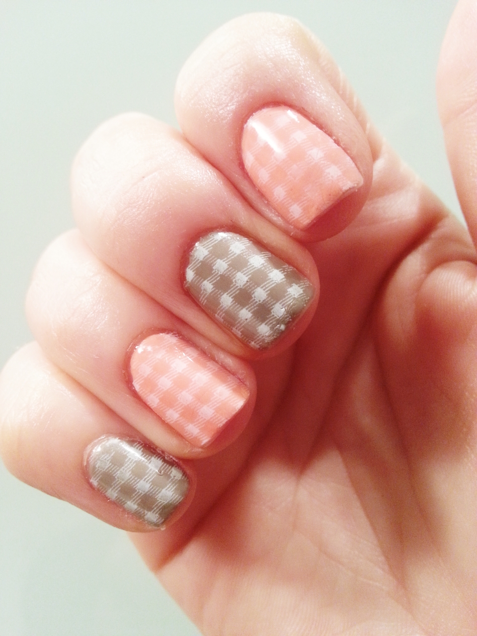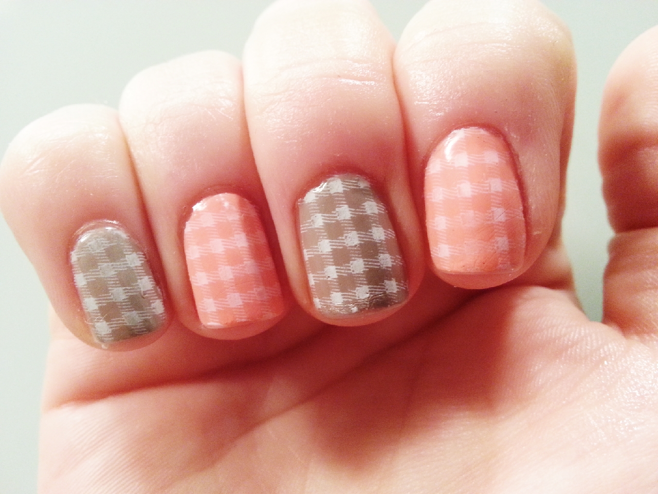 My last design is inspired by a camping tablecloth: white squares stamped on grey and pink nail polish.