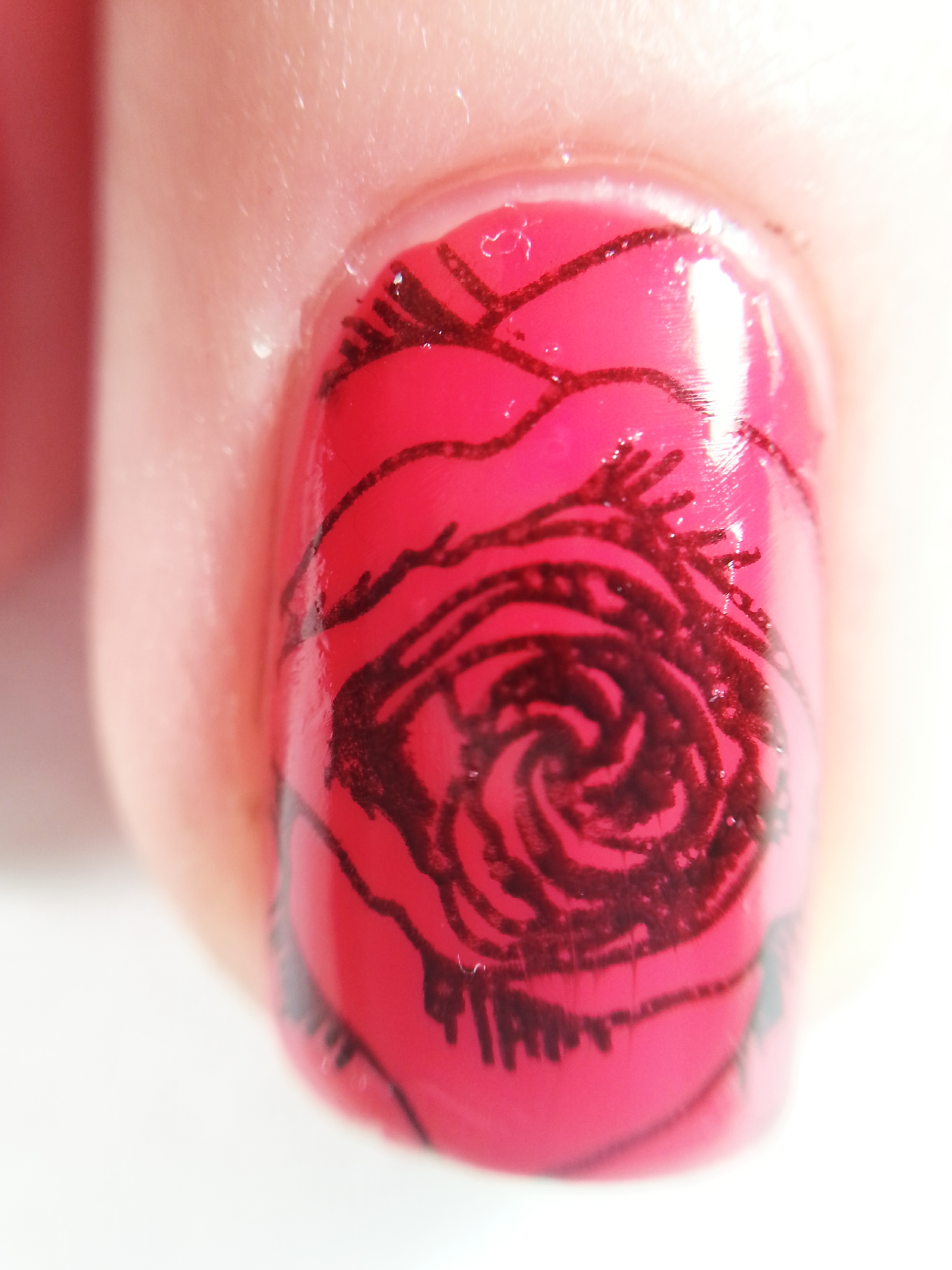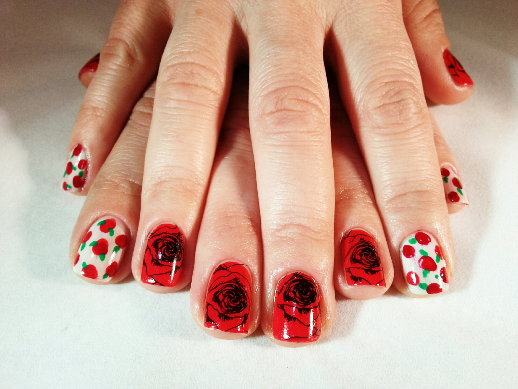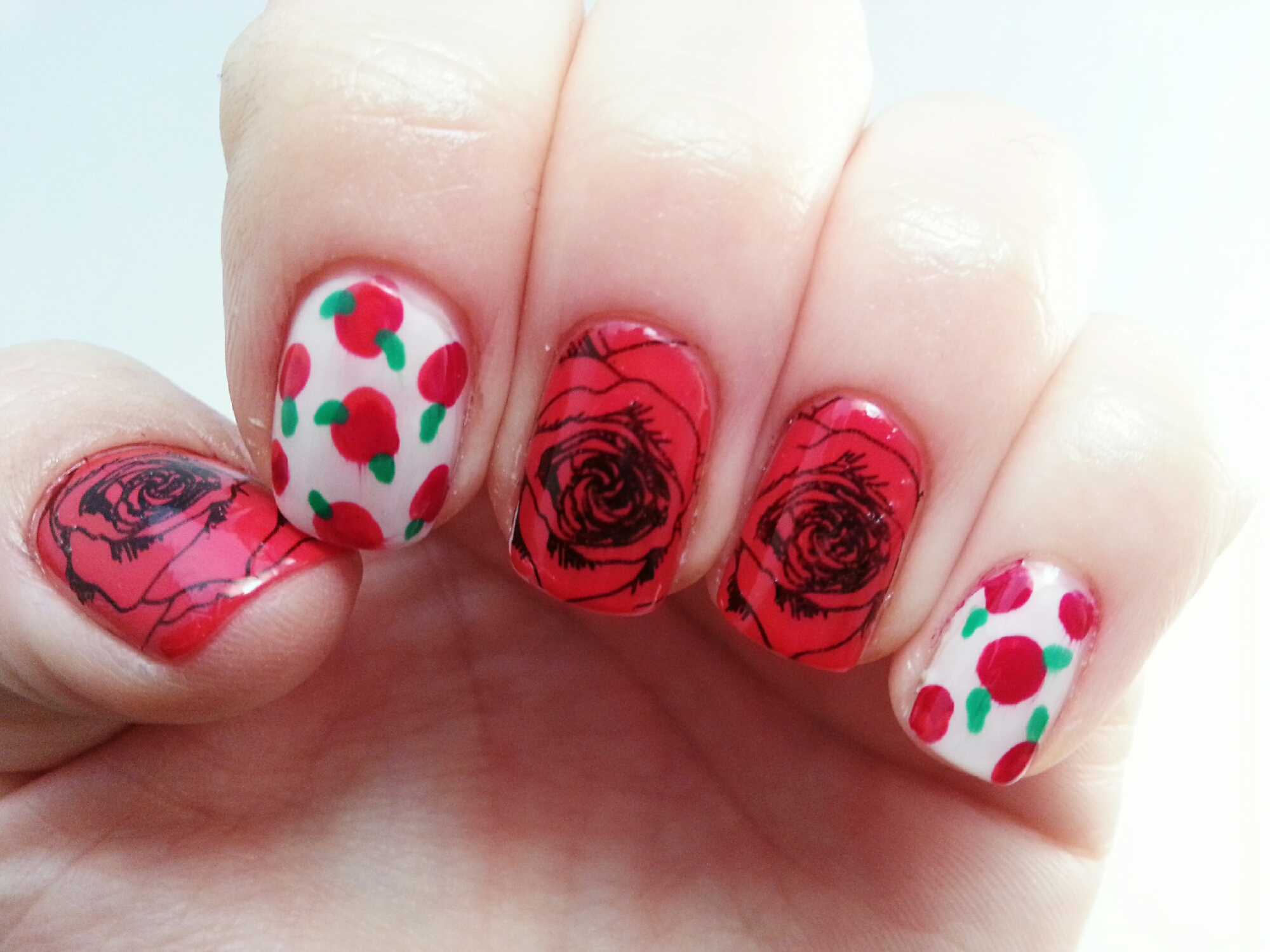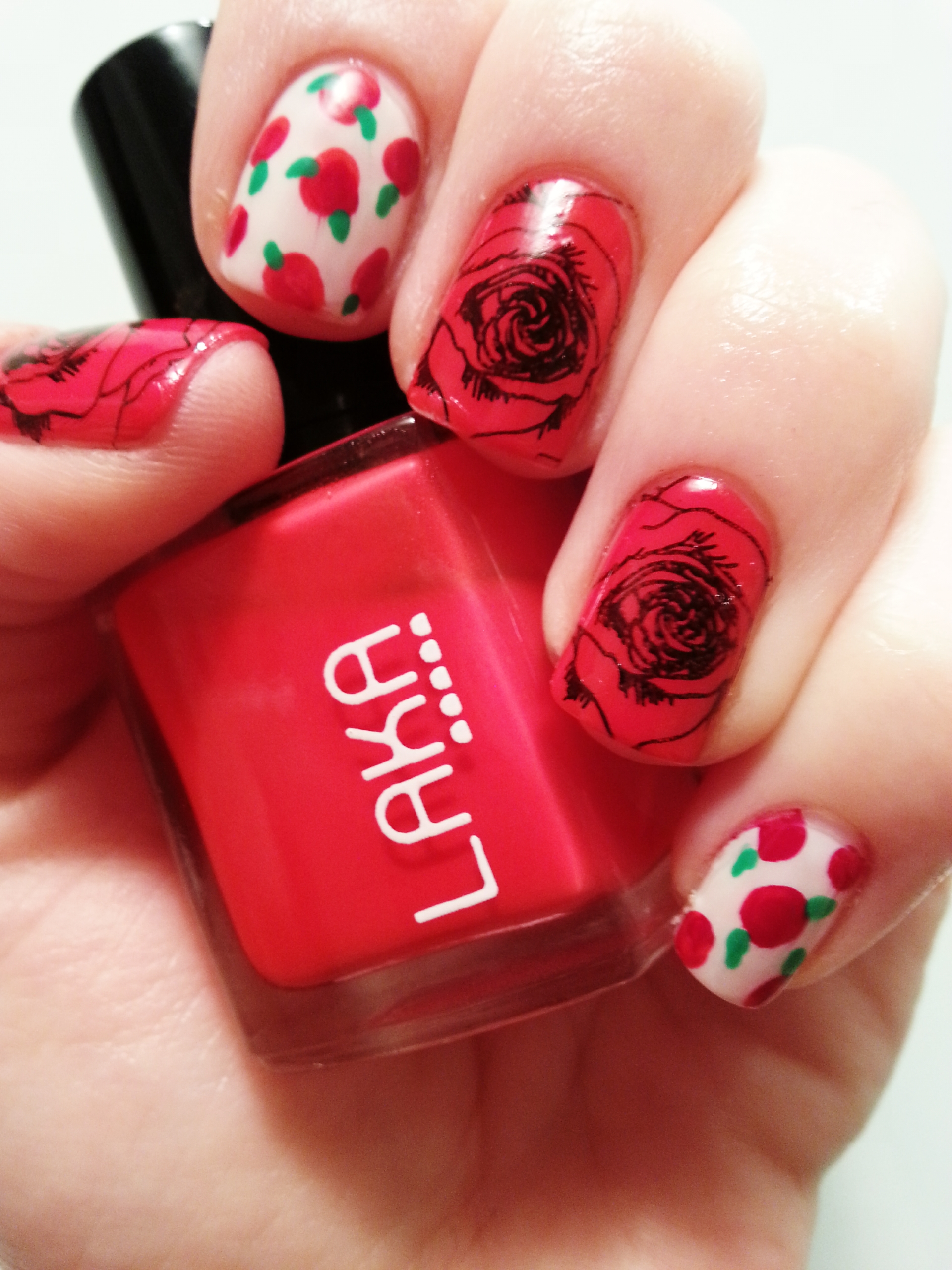 The streets of all country were full of roses and books. That is the reason why these lovely flowers are the centre of my current manicure. As you can see, I have mixed two techniques: stamping and hand-painting.