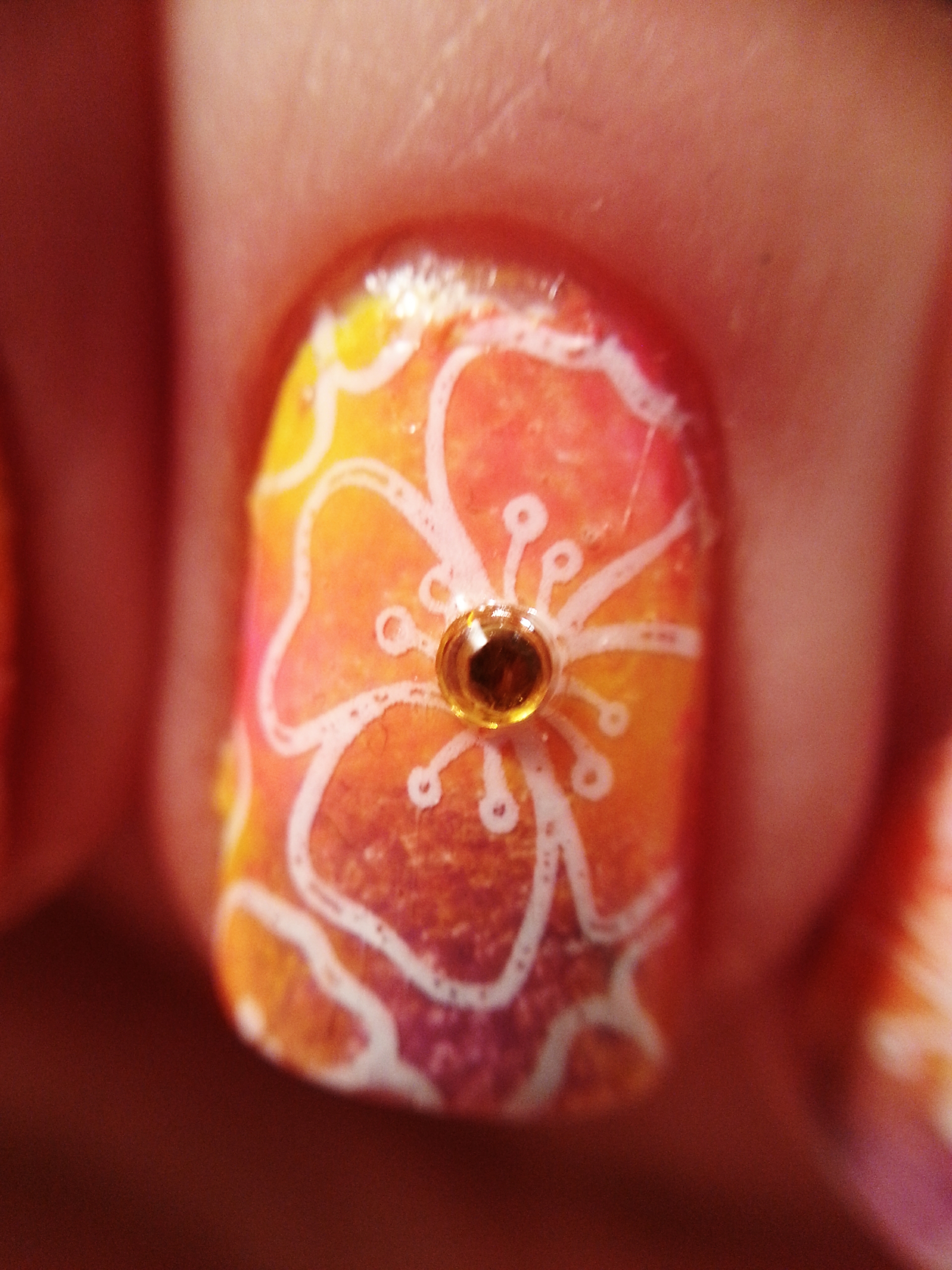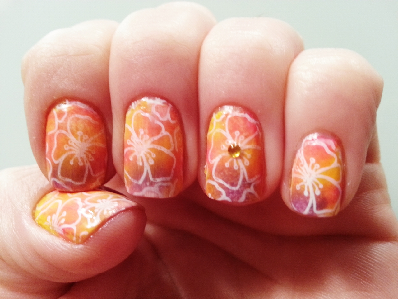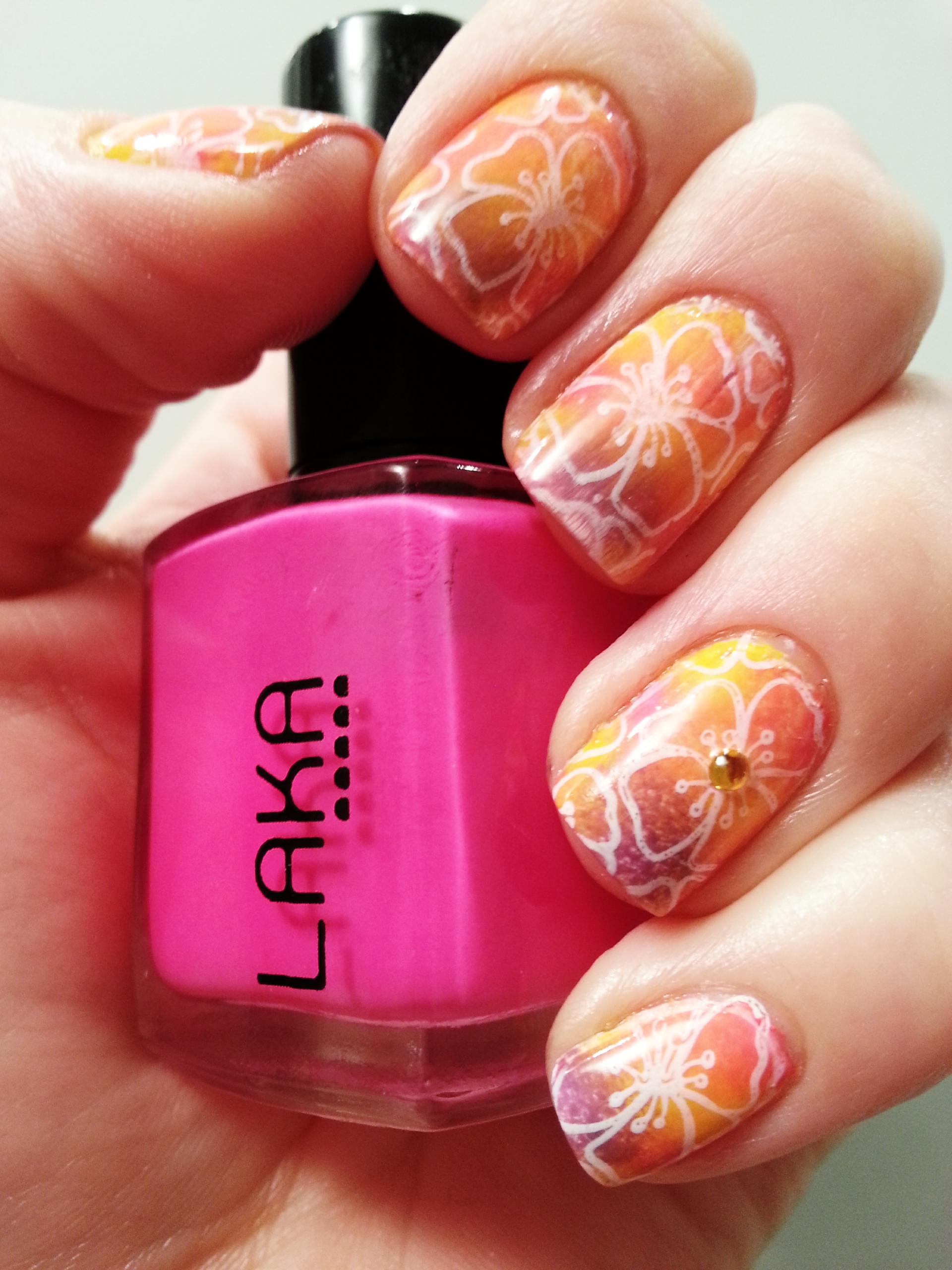 I am fine and ready to show you my last design: white flowers stamped on a gradient mix made with pink, purple and yellow. I think this manicure is perfect for summer, isn’t it?