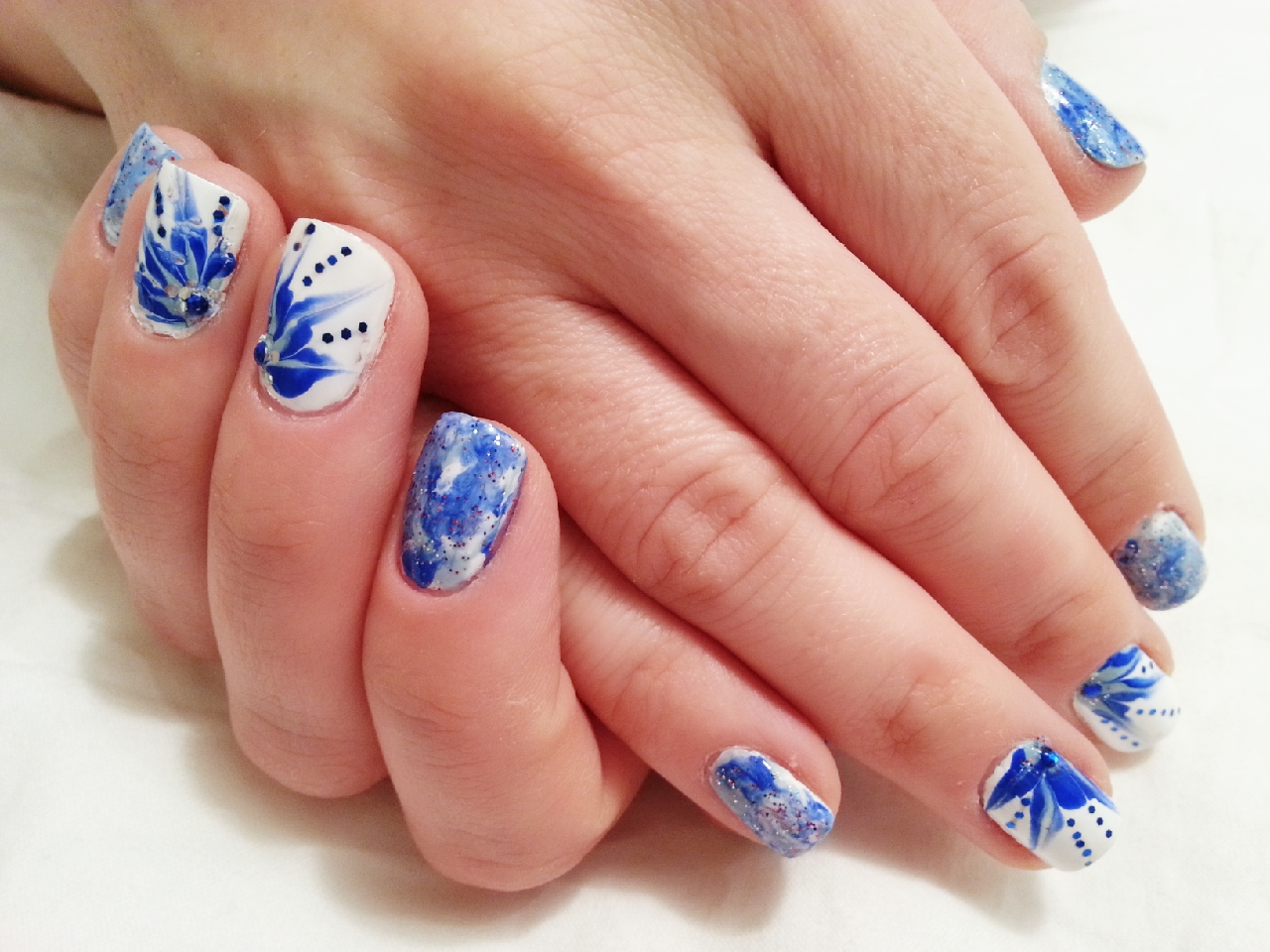 Avui, combinació de flors blaves sobre fons blanc als dits mig i anular, i a la resta de dits un mix en diferents tons de blau. Tot, pintat a mà amb esmalts estàndards.
