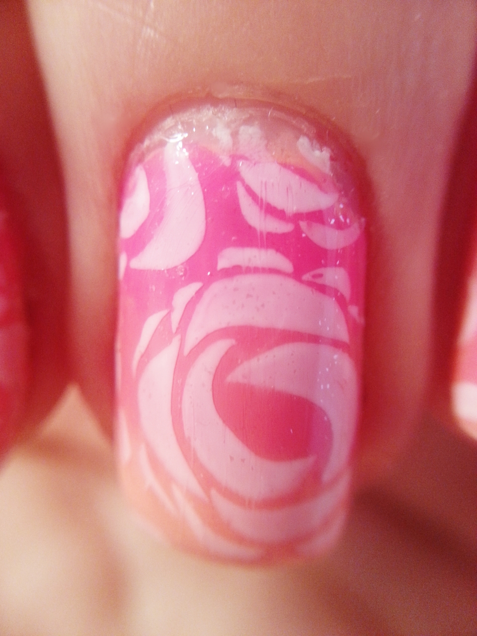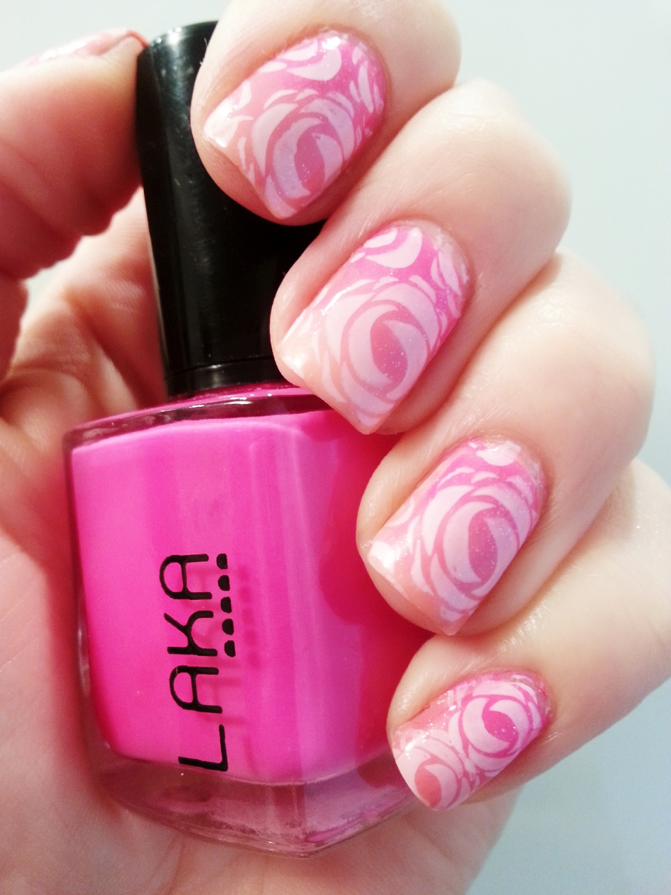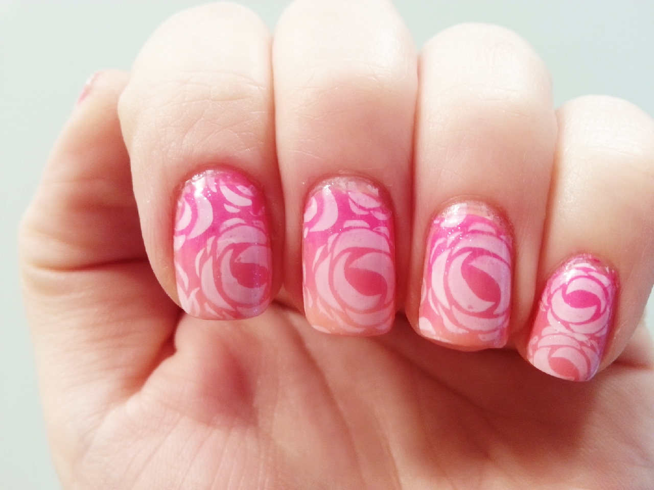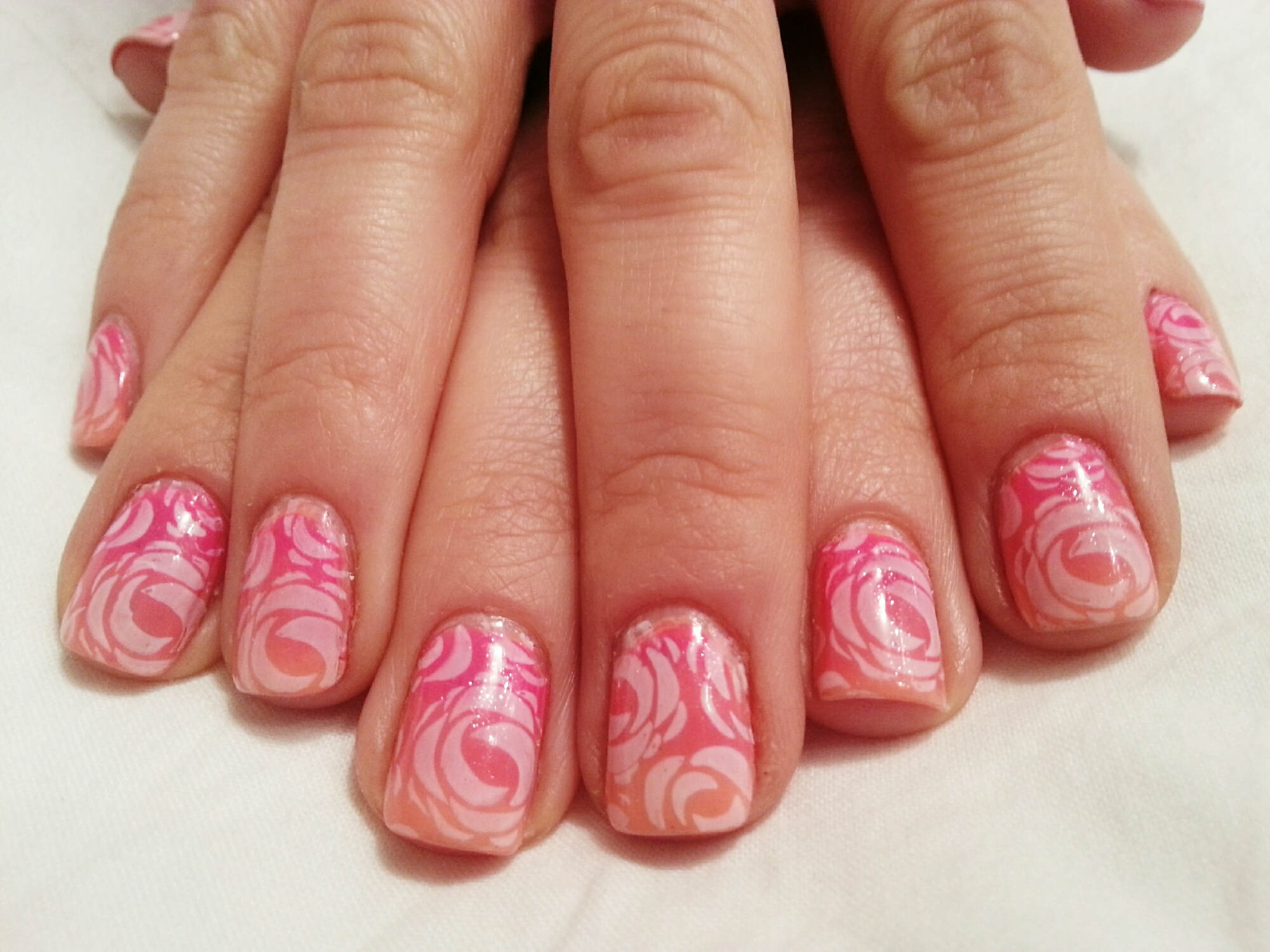 It is Friday so Nia’s nails has come back with a new post. Today, white roses stamped on a gradient of pinks. I hope you will like this romantic design and have a happy weekend.
