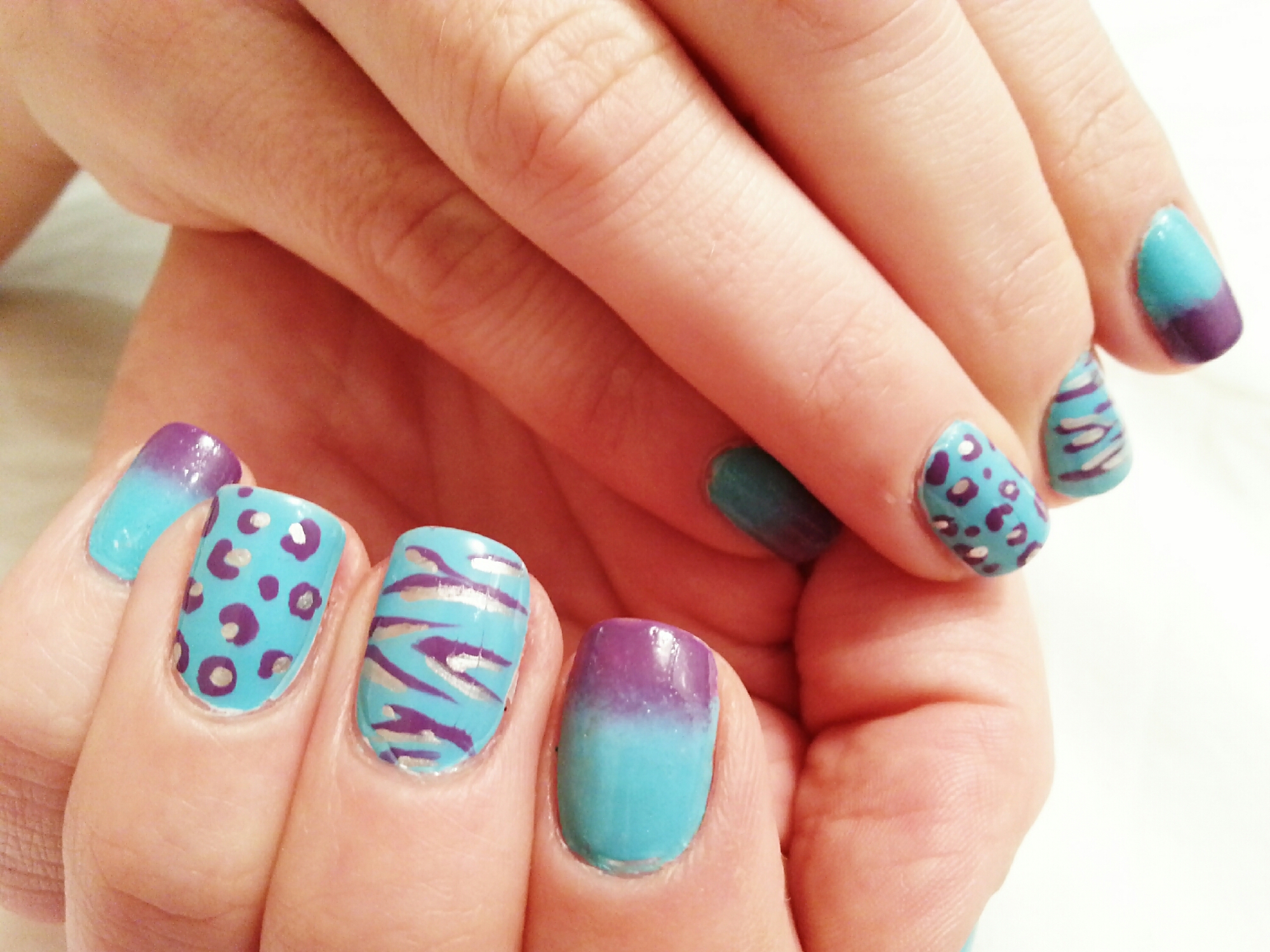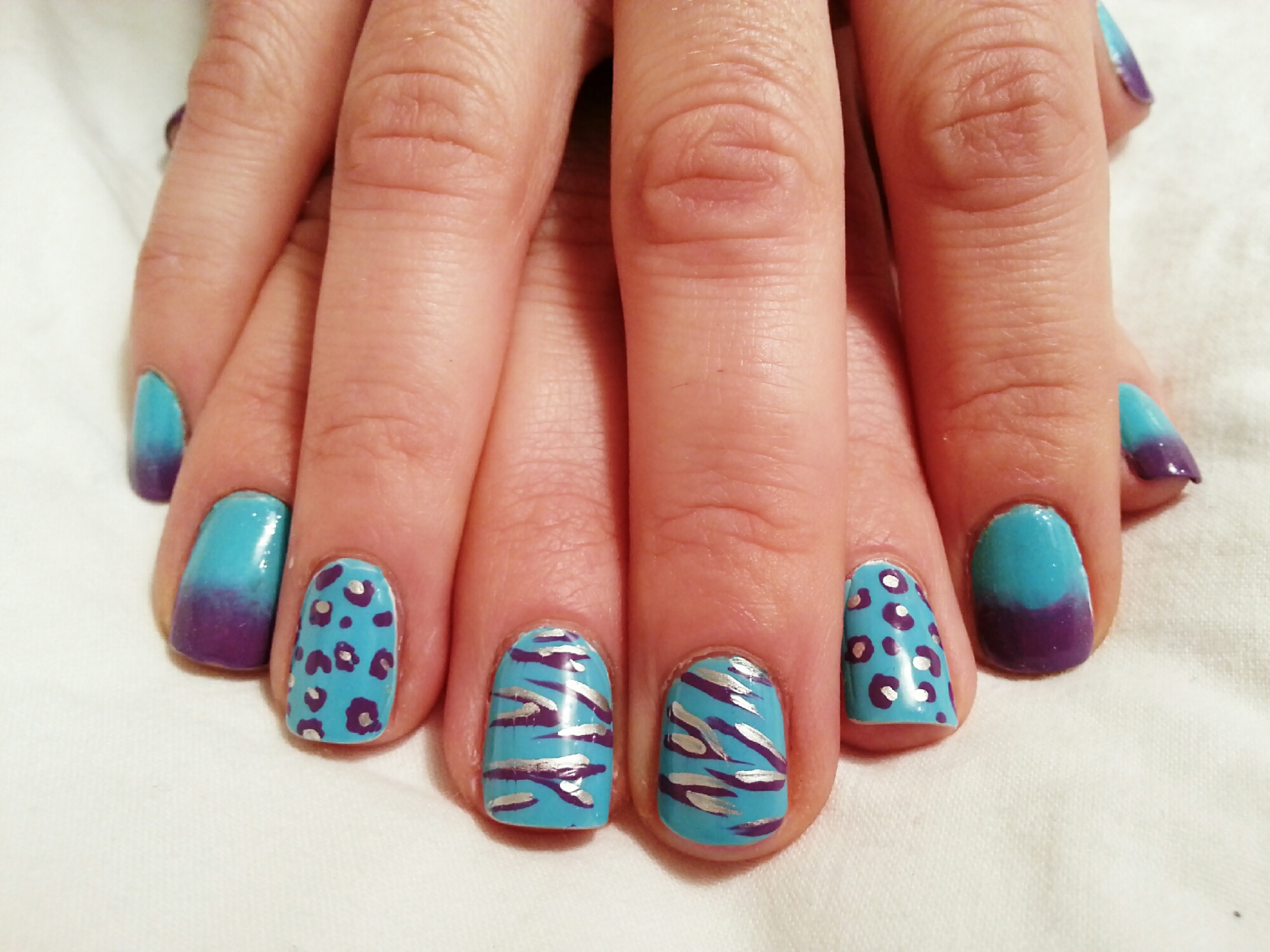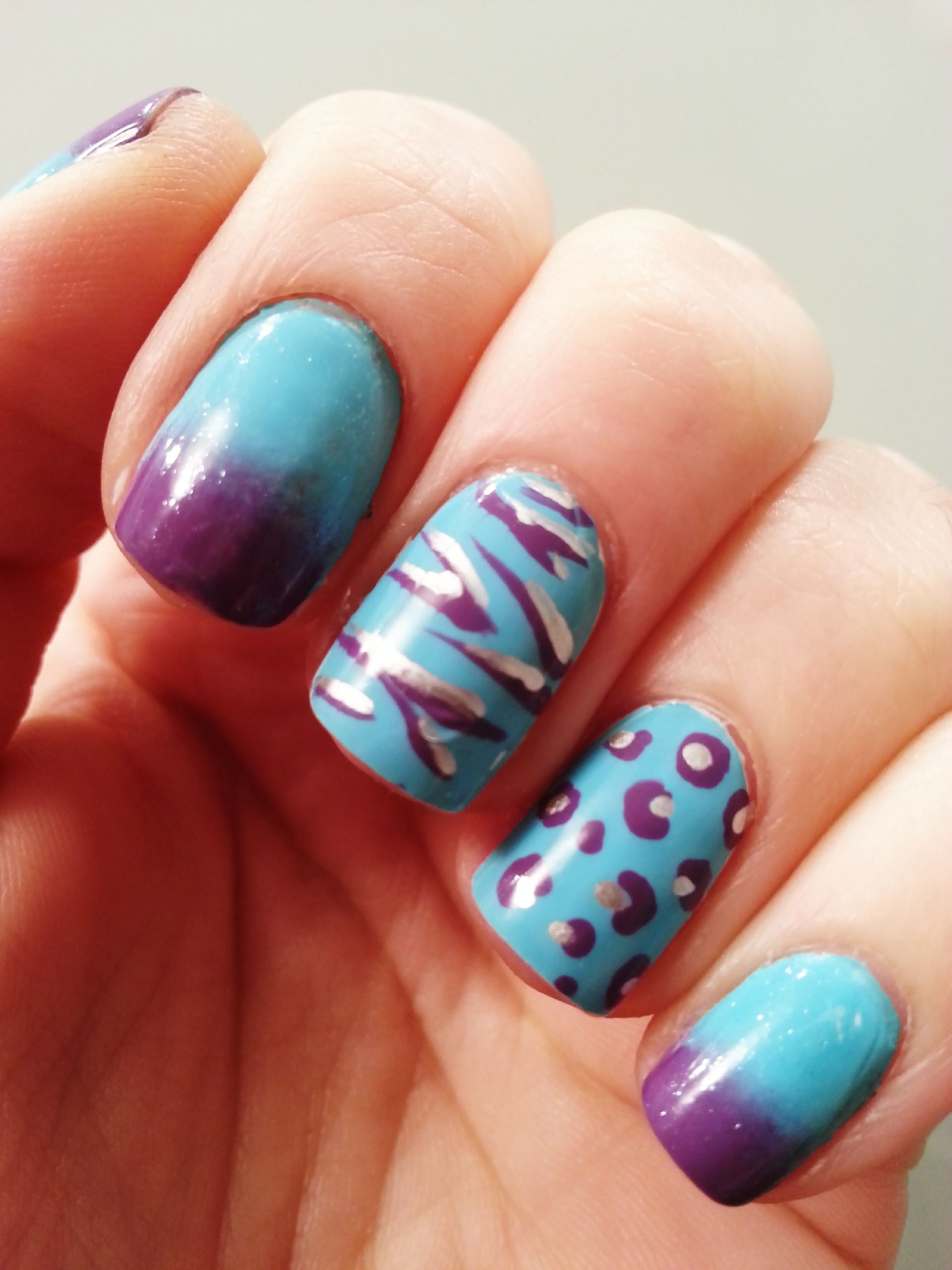 Esta semana os muestro un diseño que mezcla el degradado con el animal print. En los dedos corazón y anular, estampado de cebra y leopardo. Y en resto de uñas, degradado en azul y violeta.