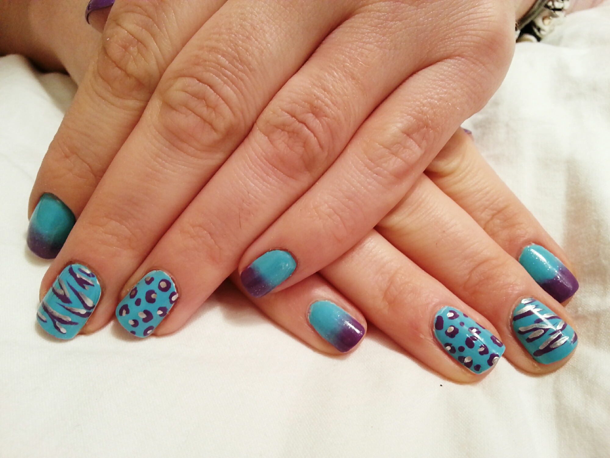 How are you? I am happy to show you my last design, which combines animal print and gradient nails in blue and purple.