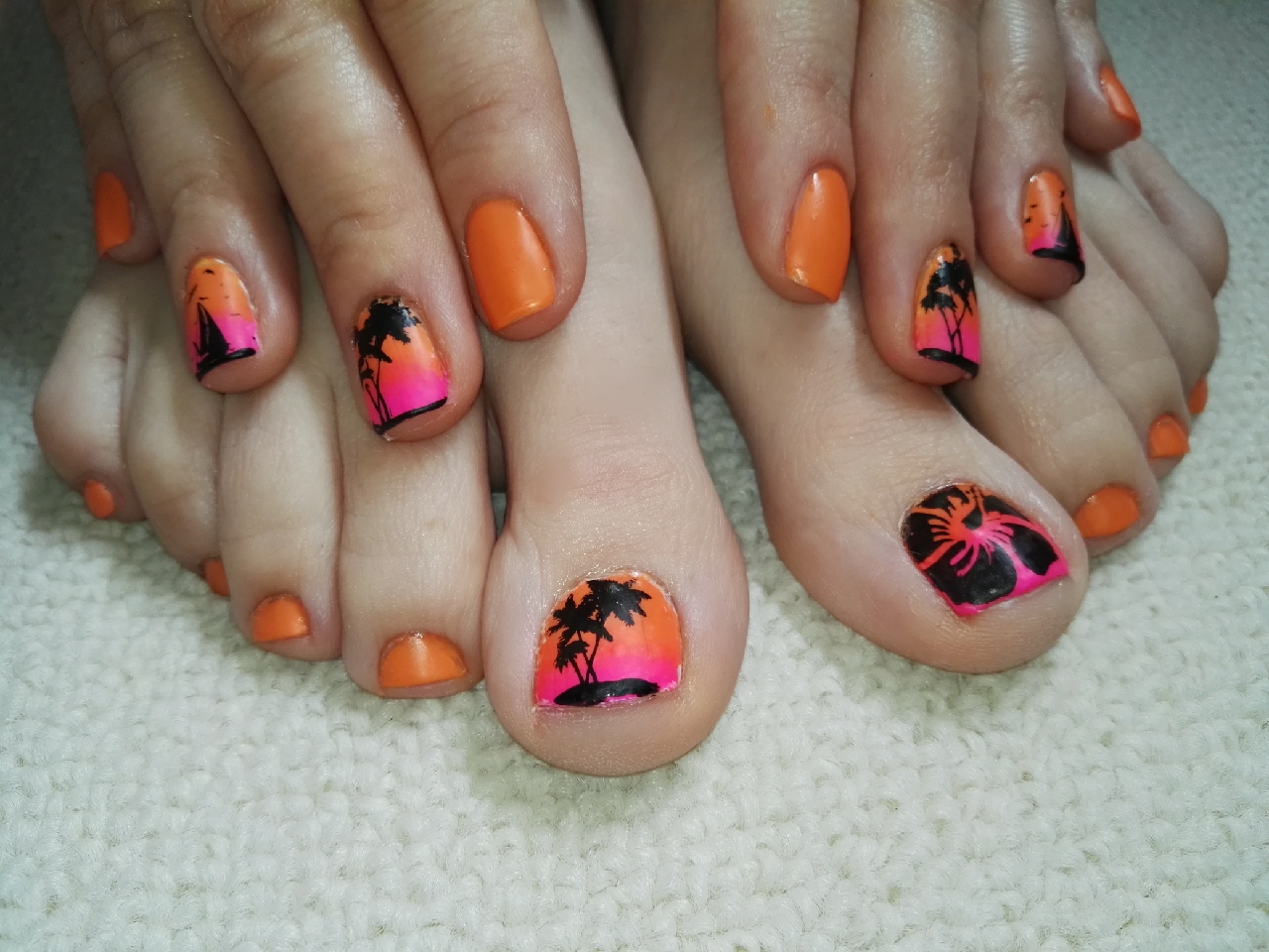 Ya sabéis que me encanta el verano, y lo transmito con mis diseños. En esta ocasión, el naranja es el color principal y lo combino en degradado con rosa fluorescente en los dedos corazón y anular.