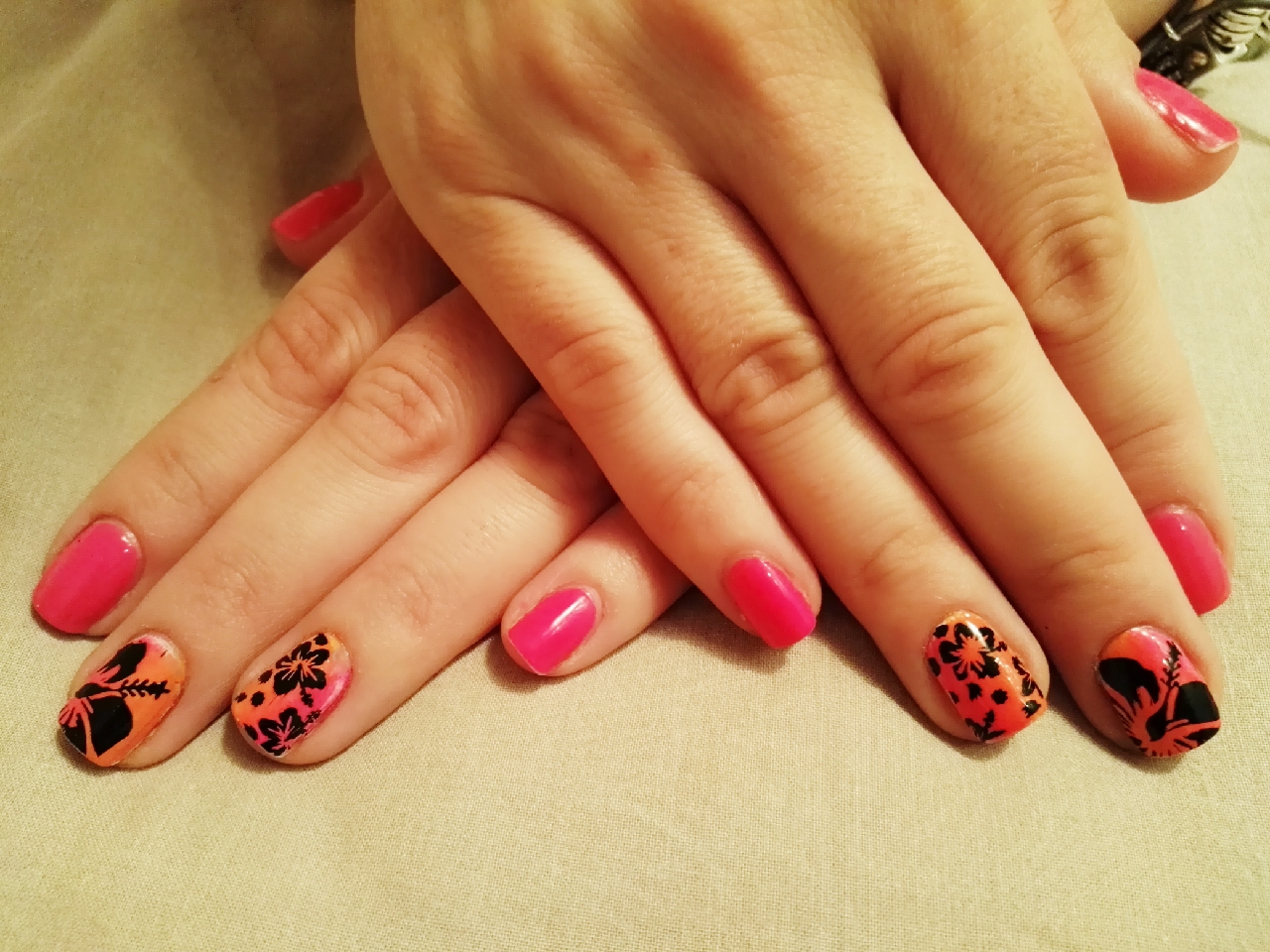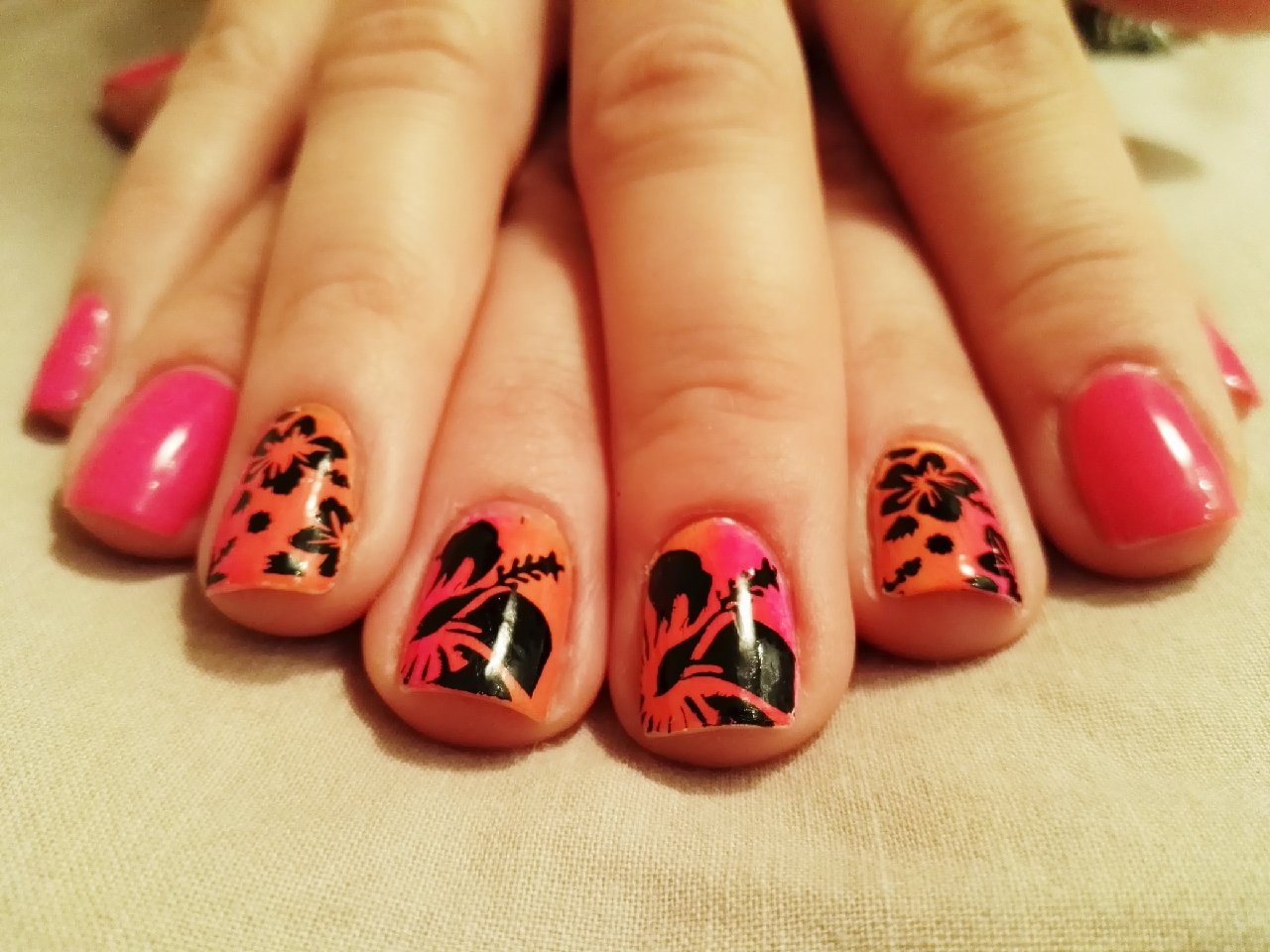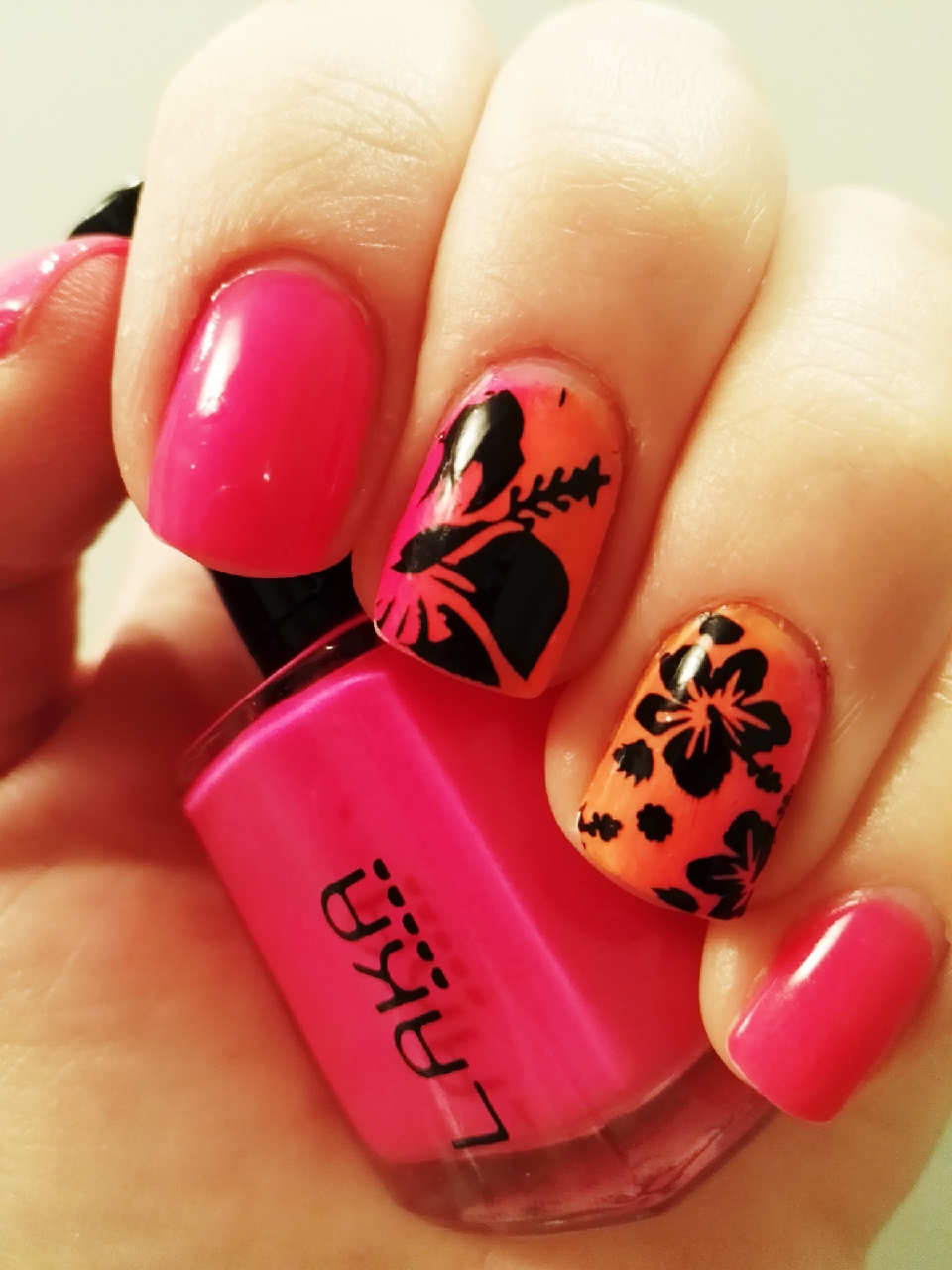 Hoy me siento surfera, así que he elegido unas flores hawaianas como protagonistas de mi manicura. Como veis, están estampadas en negro sobre un fondo que funde en degradado el rosa con el naranja.