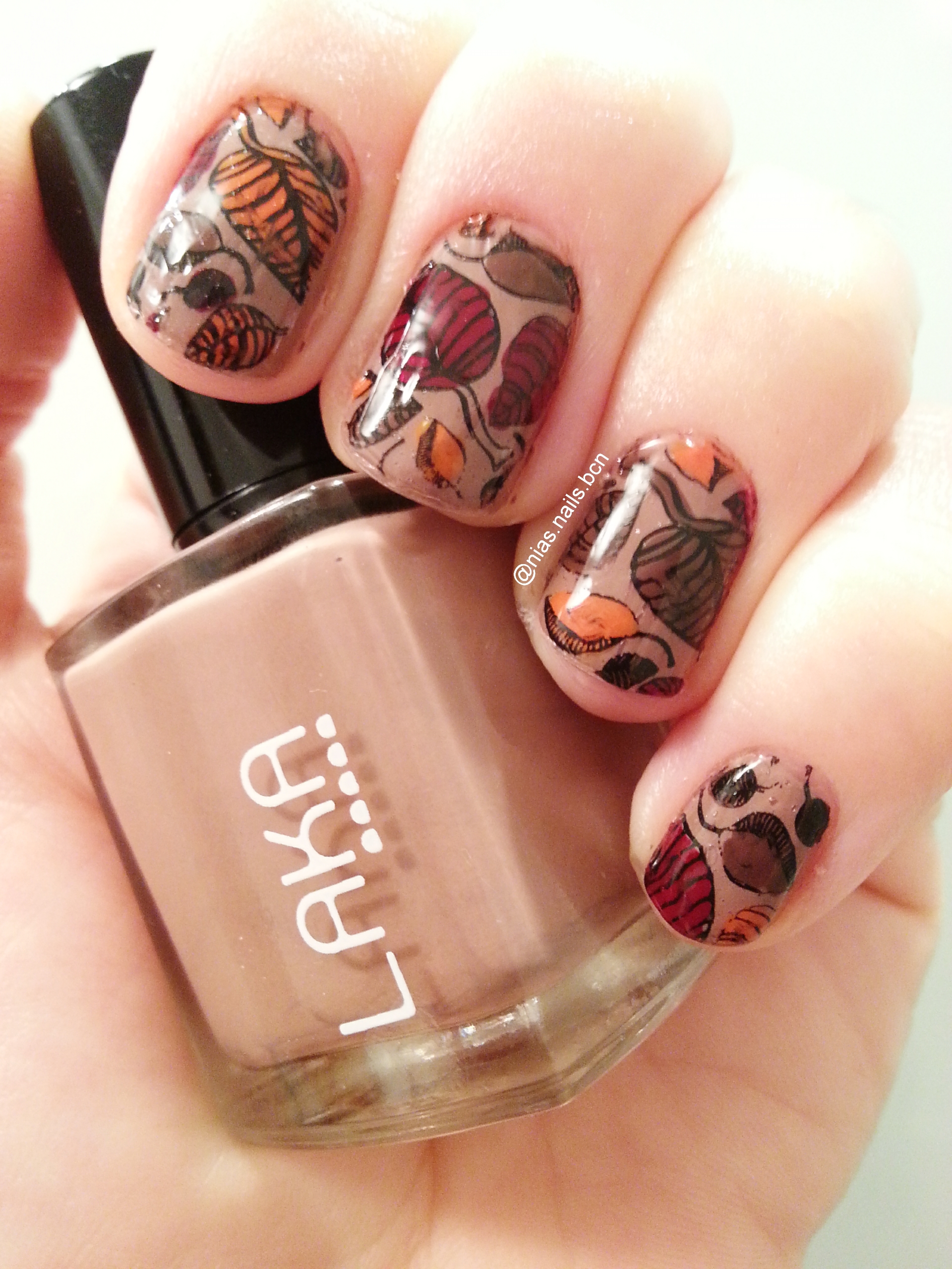 Aquesta manicura n’és una bona mostra. Sobre un fons marró clar, fulles estampades i pintades en granat, carbassa i marró fosc. Si voleu saber com fer-la, esteu atents al blog ja que, ben aviat, publicaré el vídeo tutorial.