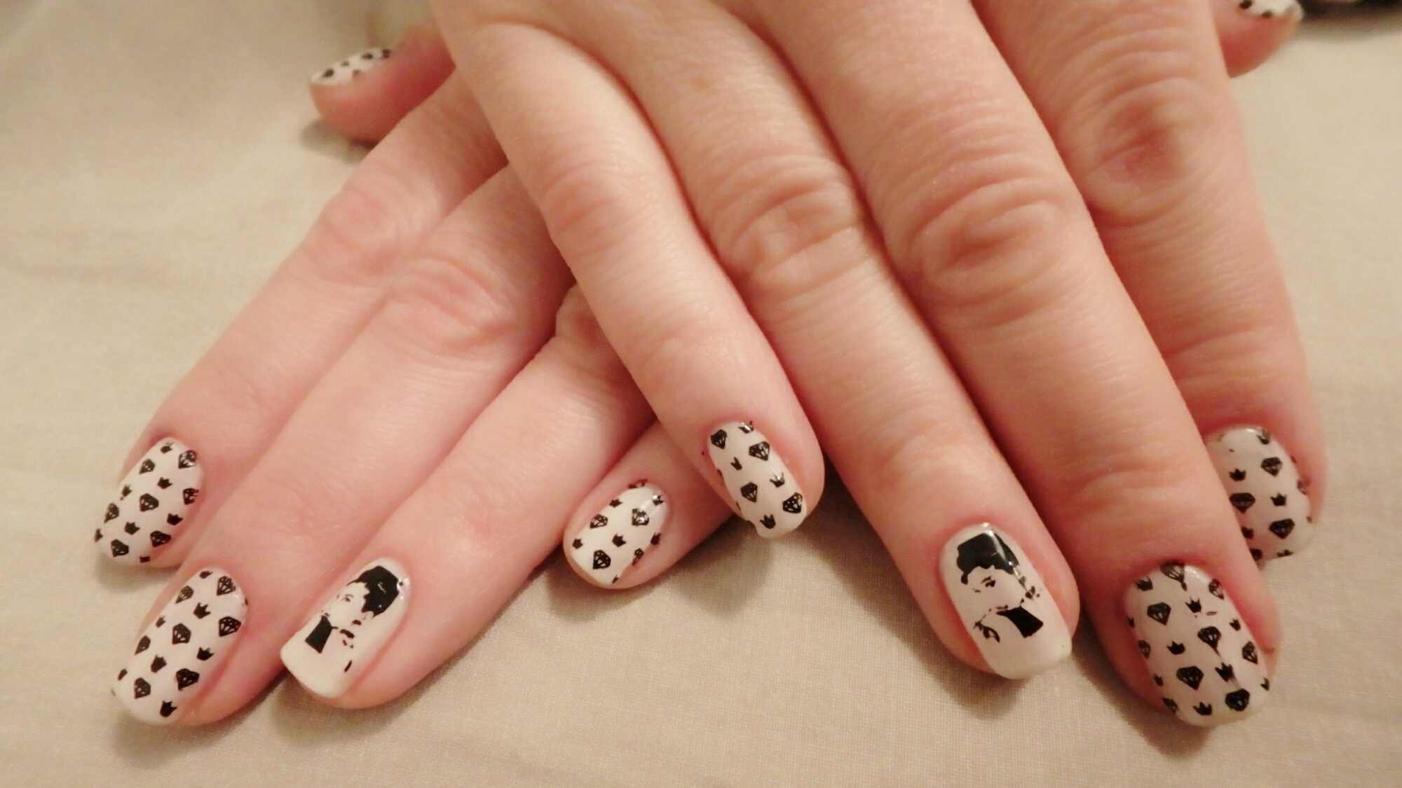 Como veis, se trata de una diseño en blanco y negro, realizado con la técnica del estampado. En el dedo anular, una imagen de Audrey; en el resto, coronas y diamantes.