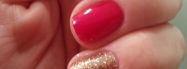 Manicura bàsica en vermell amb un toc de purpurina daurada.